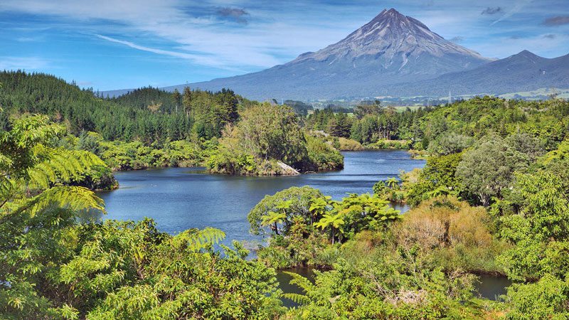 Egmont National Park, on the western coast of the North Island, is dominated by a perfectly shaped volcanic cone known as both Mt Egmont and Mt Taranaki. This peak has a symmetry and profile that resembles Japan’s Mt Fuji.