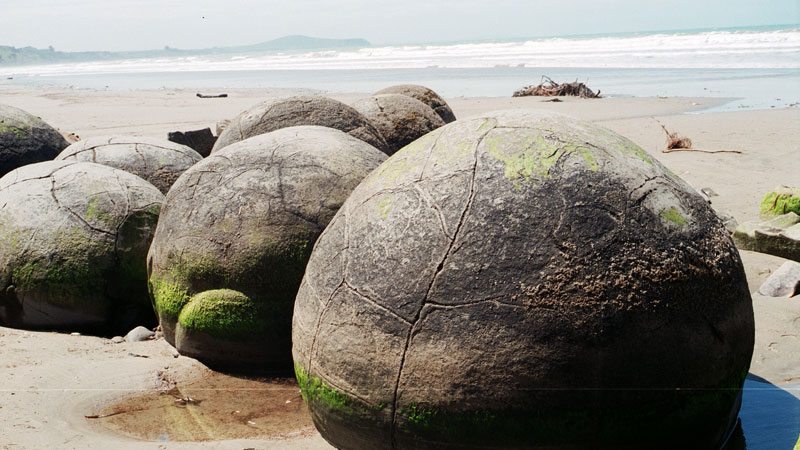 The road to Dunedin offers great ocean views, good beaches and at times a glimpse of resident dolphins. A brief side trip to Moeraki is recommended to view the amazing spherical boulders scattered over the beach. They formed their symmetrical shape by gradual concretion as mineral deposits formed around a nucleus, similar to the growth of an oyster pearl. These ‘Devil’s Marbles’ began their life around 60 million years ago and weigh several tonnes.