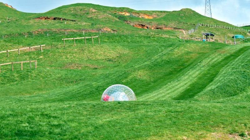 The sport can be enjoyed by people of all ages who don’t mind being strapped inside an enormous clear plastic, air-cushioned ball. You are actually quite secure inside the inner capsule. All the violent bouncing is absorbed by the bigger outer transparent ball. As the ball rolls down a long grass-covered slope, you spin around in a virtual anti-gravity form of weightlessness like an intoxicated space traveller. As you tumble head over heels, the build up of centrifugal force keeps you pressed hard against the plastic wall, so it’s easy to ‘go with the flow’ and enjoy the revolving view outside.