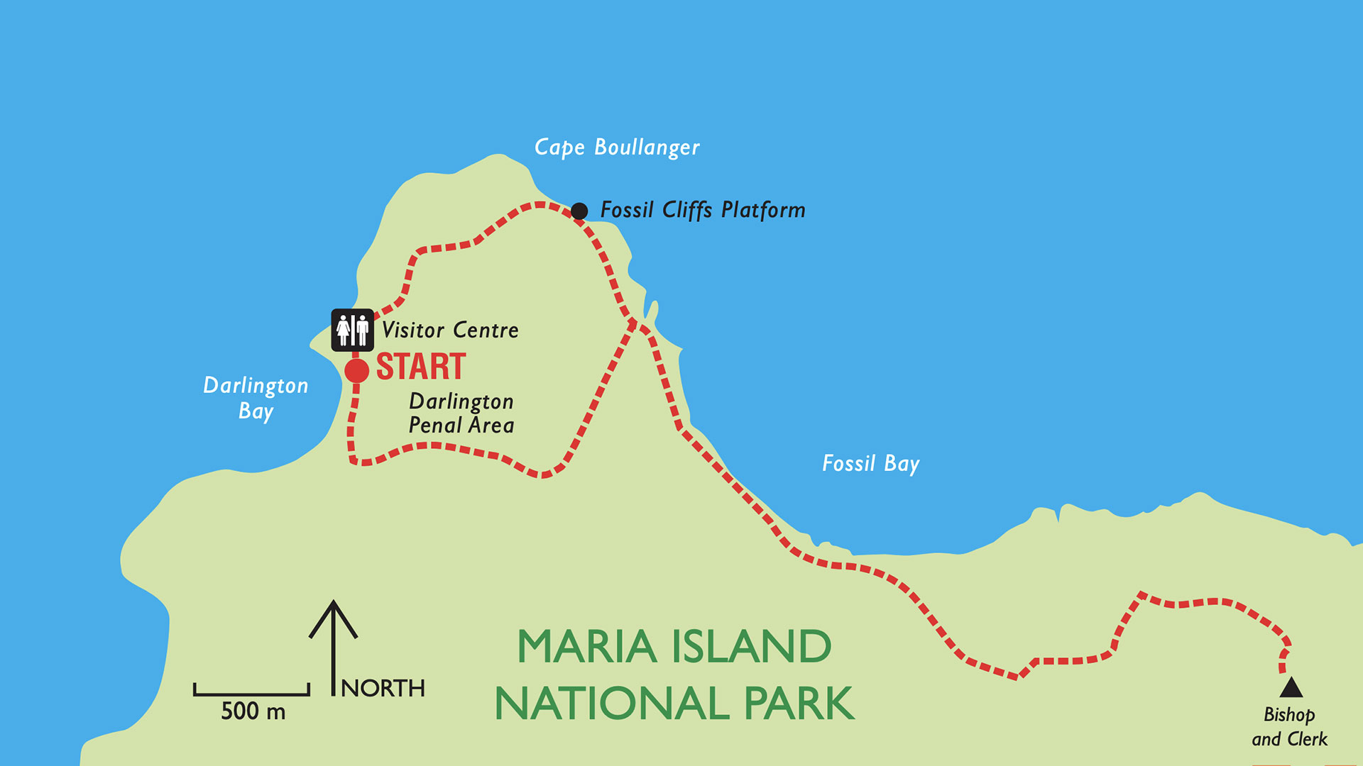There are three main walks on the island. The first two include a short circuit, taking in the Fossil Cliffs Platform. The second walk, which comes off the circuit, is to the Bishop and Clerk pinnacle. The third walk (see next page) is the Painted Cliffs walk.