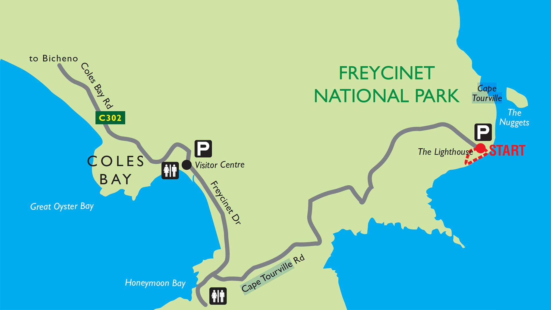 From the Tasman Highway (A3) turn onto C302 and once inside the park turn left onto the Cape Tourville Road.