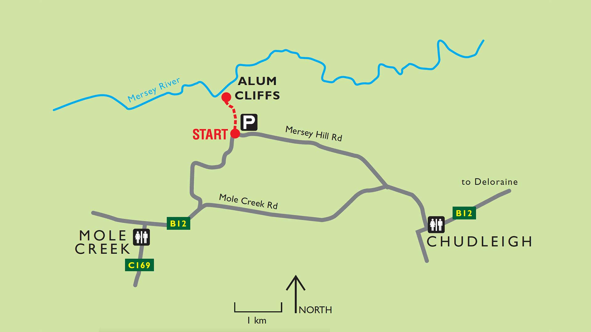The closest toilet facilities can be found a Mole Creek about 3.5km away and at Chudleigh.