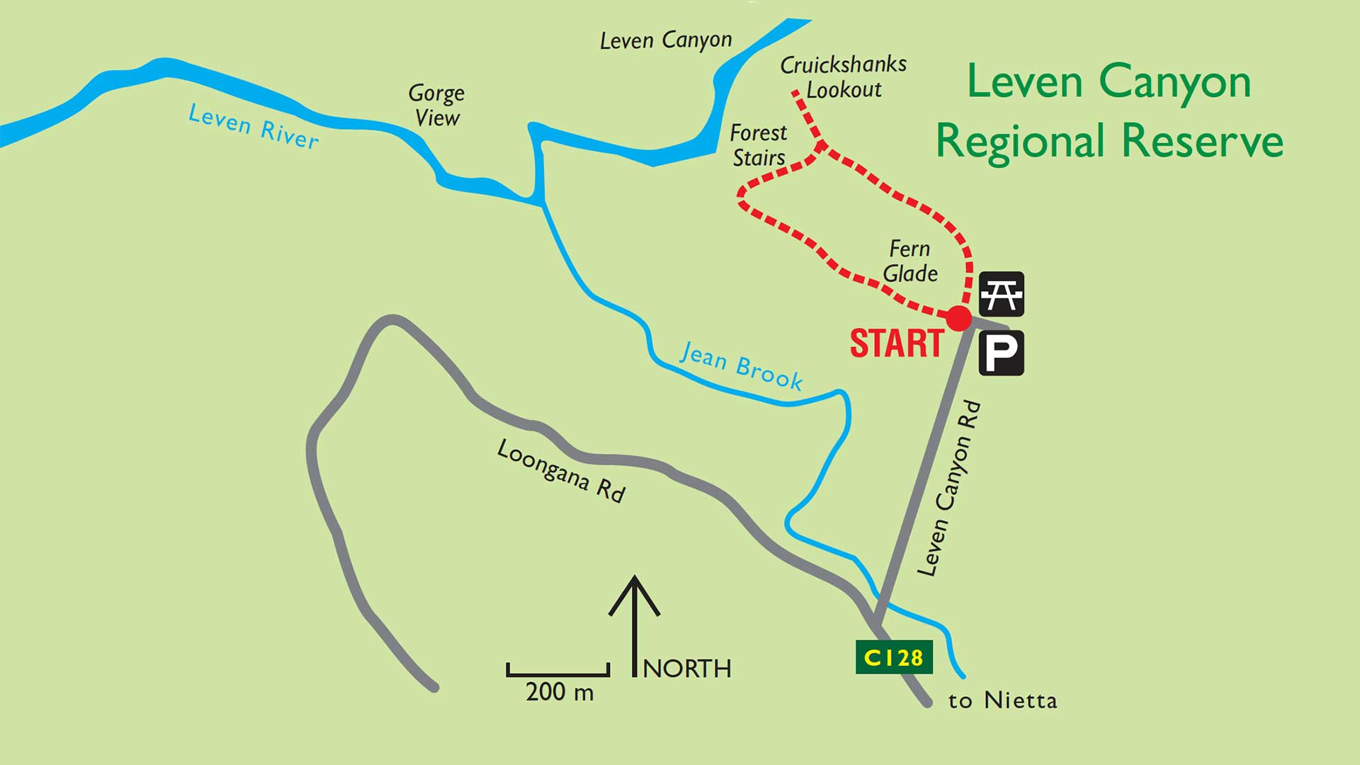The circuit starts at Fern Glade and makes its way to the Cruickshank Lookout some 275m above the Leven River.