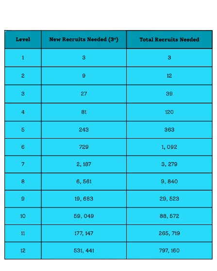 - At Level 2, each of those 3 recruits their own 3 so that’s 9 new people.