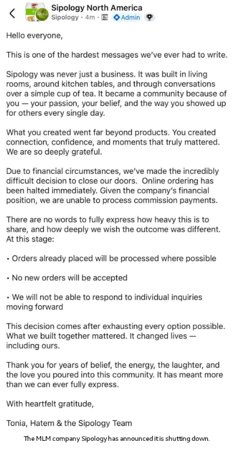 Sipology (formerly Steeped Tea) has abruptly terminated its MLM opportunity and halted operations, leaving thousands of distributors without commissions and customers uncertain about outstanding orders. The shutdown, announced through a brief notice on Sipology’s website, cites unspecified “financial circumstances” and offers no timeline for resolution.