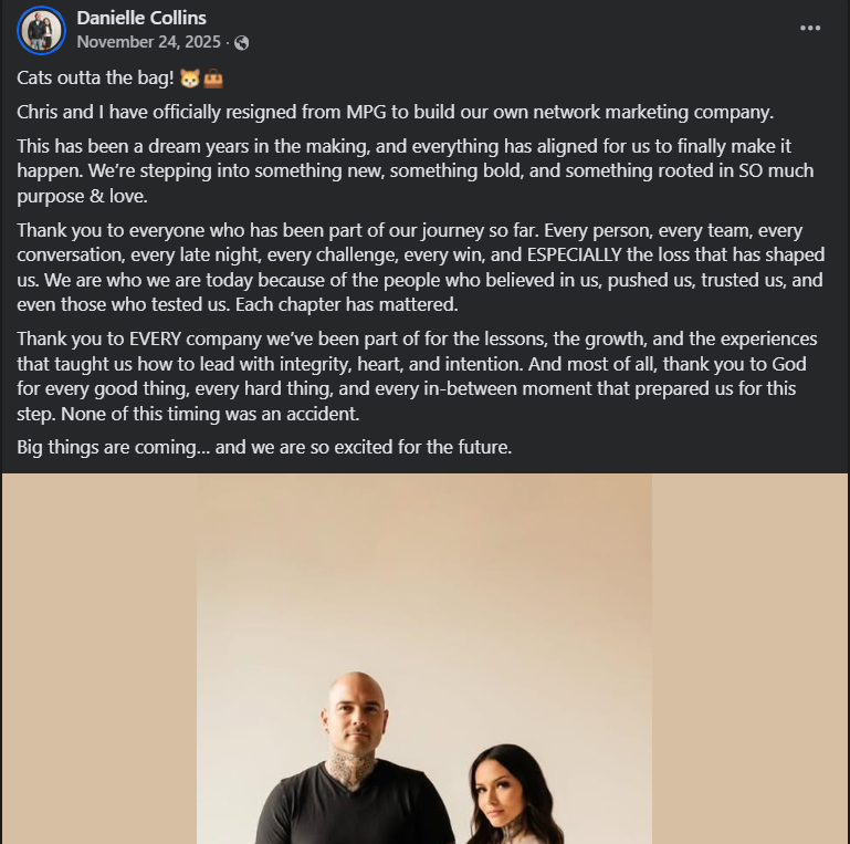 The couple’s connectiong to MPG is not inferred — it is directly confirmed by Danielle herself. In a Facebook post dated November 24, 2025, she announced that she and Chris had officially resigned from MPG to build their own network-marketing company.
