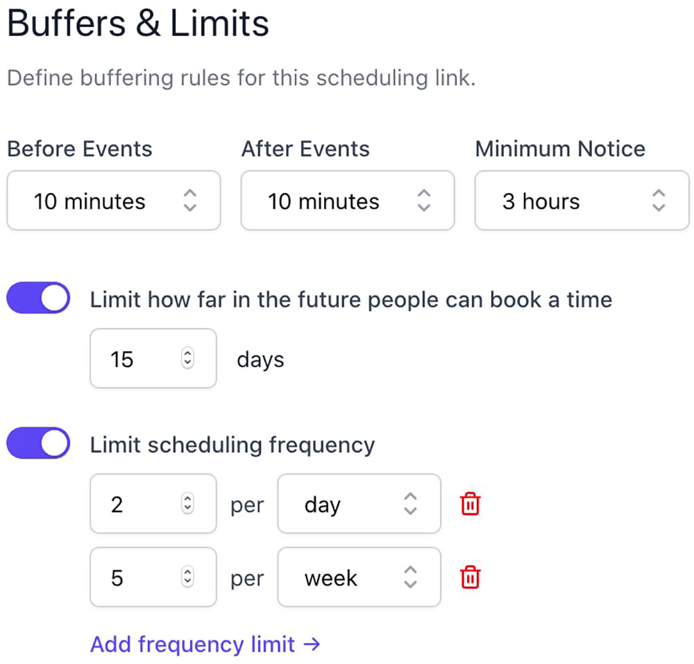 Set limits for how many meetings can be booked per day, week, or month so you always reserve time for deep work.