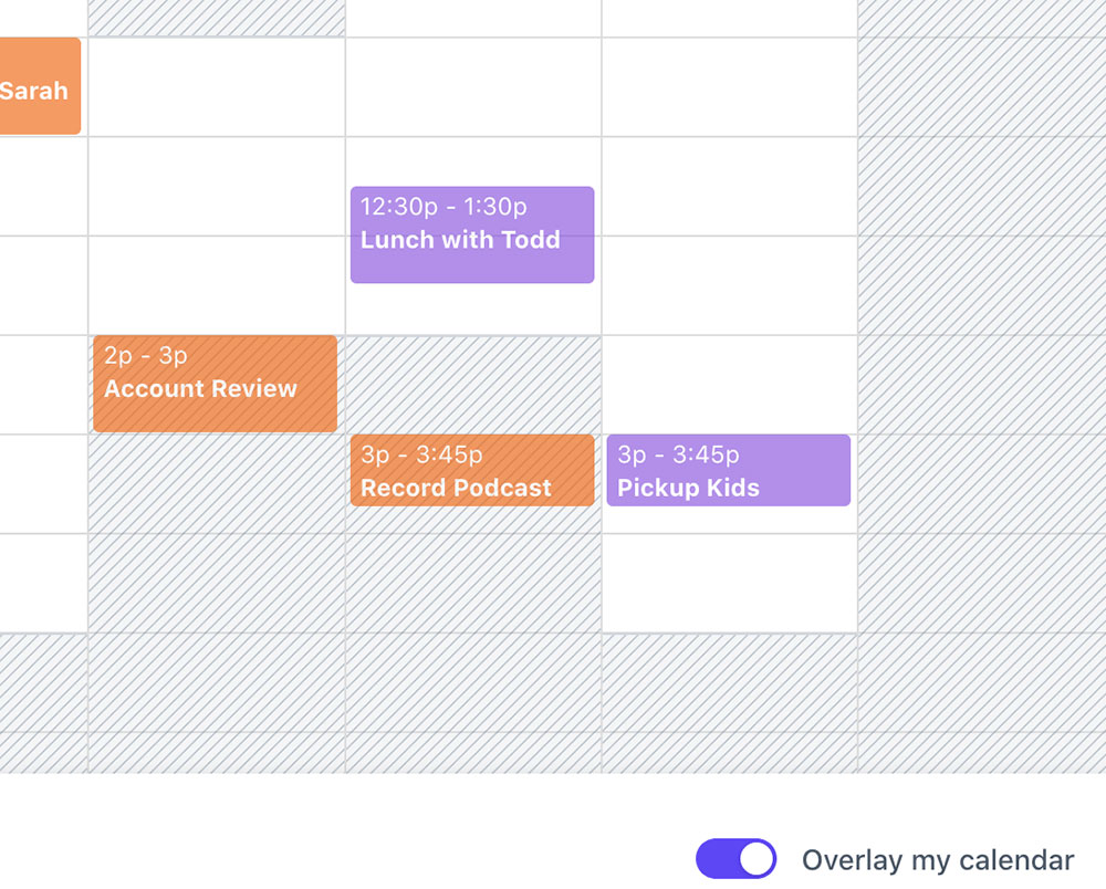 Allow recipients to overlay their calendar on top of yours to instantly find a time that works for everyone.