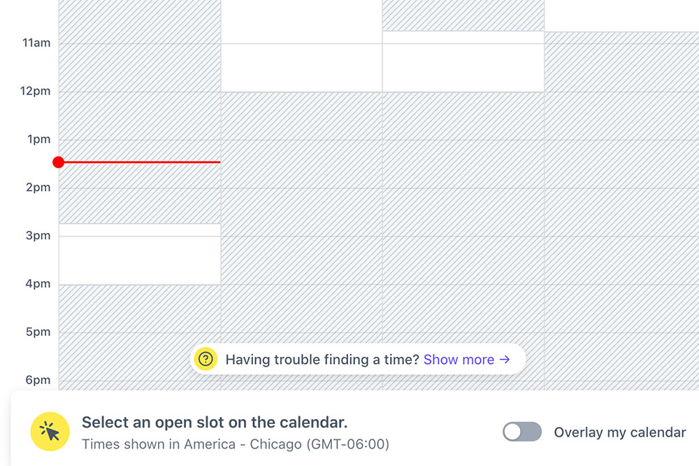 The traditional scheduling tools put the burden on the recipient, which can be even more inconvenient than trading emails in the first place. Recipients have to click back-and-forth between screens to check their calendar. Can’t find a time that works for them? They’ll have to request another link. Need a longer meeting time? Yep, request another link.