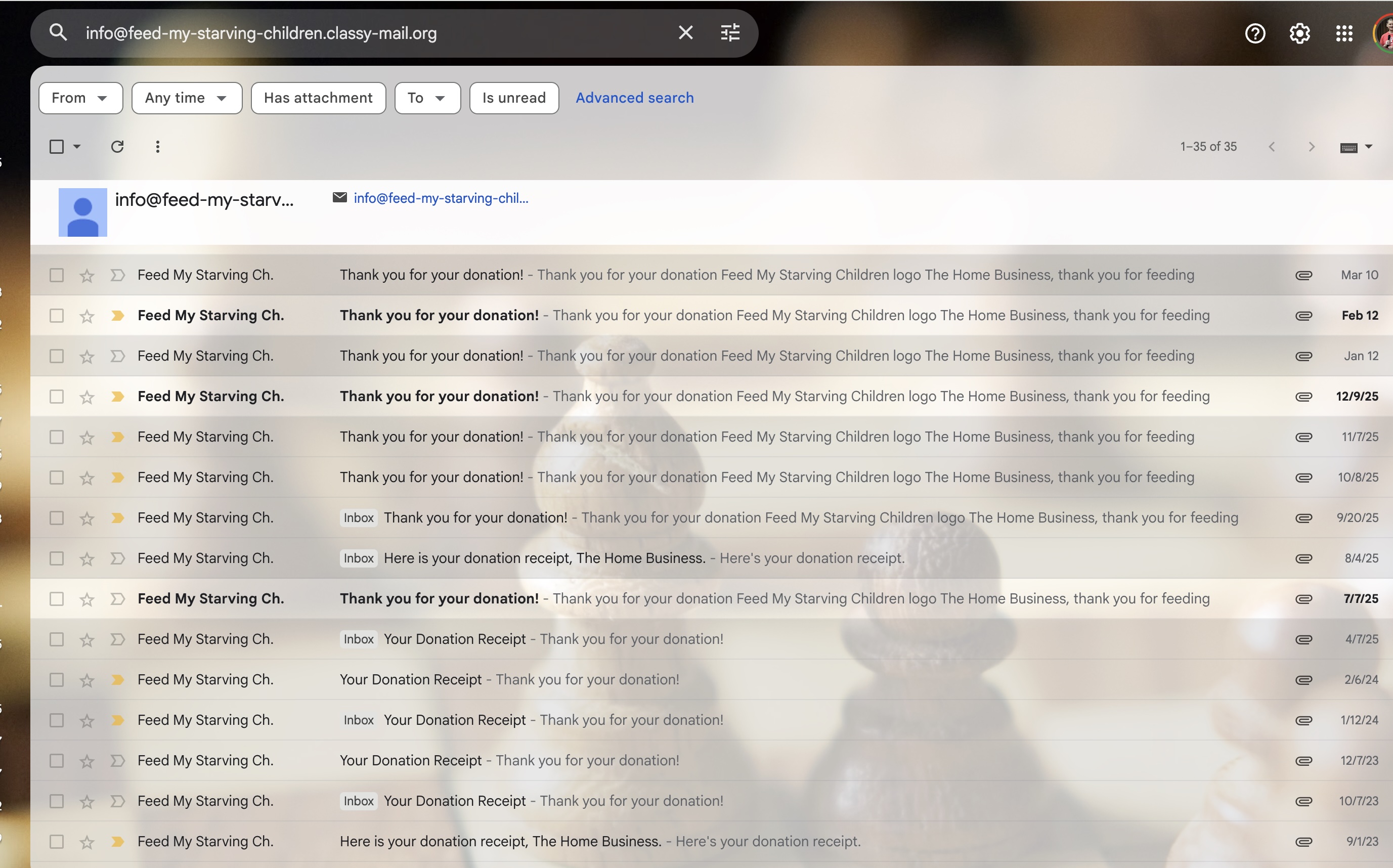 - A screenshot showing donation receipt emails from Feed My Starving Children confirming consistent monthly contributions going back years