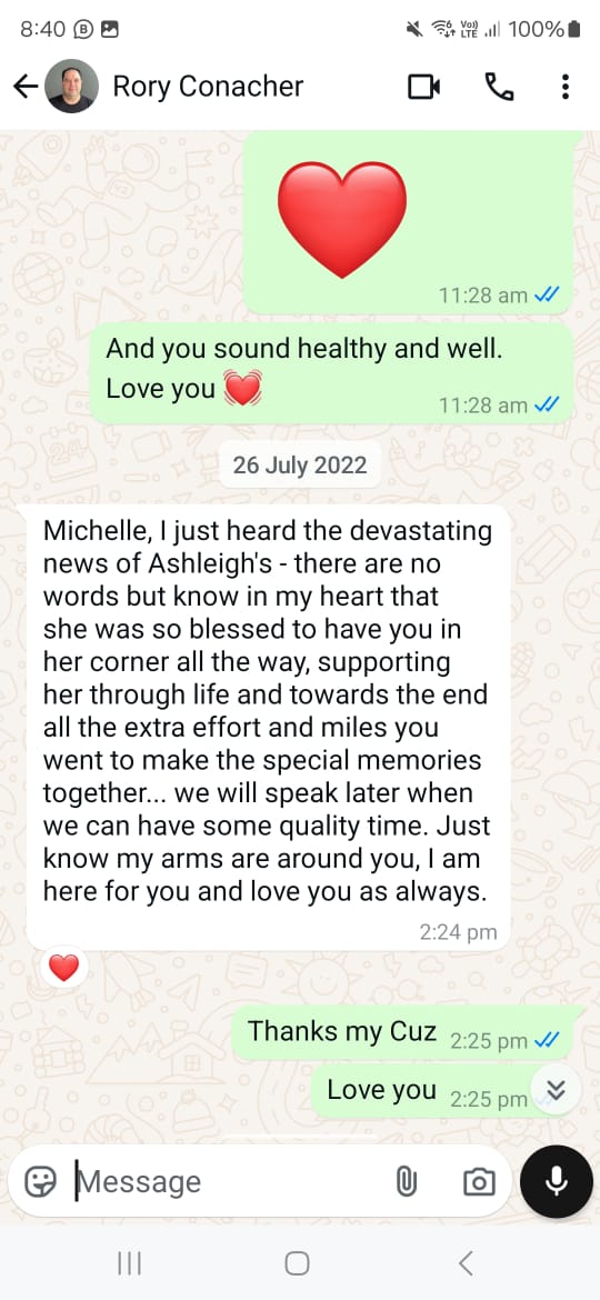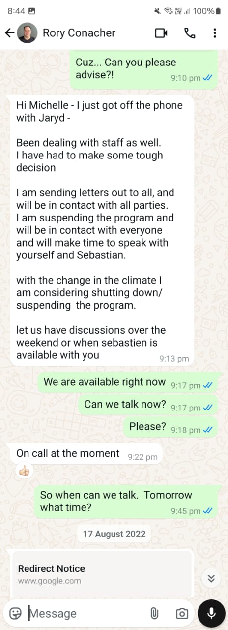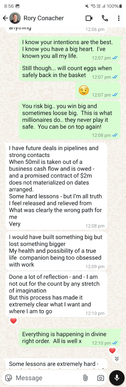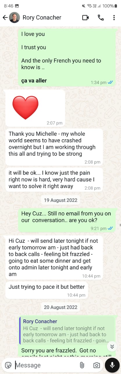 In 2022 and 2023, both my husband and I were independently speaking with Rory. Sebastien trusted that Rory would eventually pay us back, but I was becoming more doubtful. Whenever I felt worried, Rory would say all the right things to reassure me, and I would feel better again. [10]