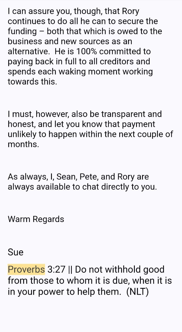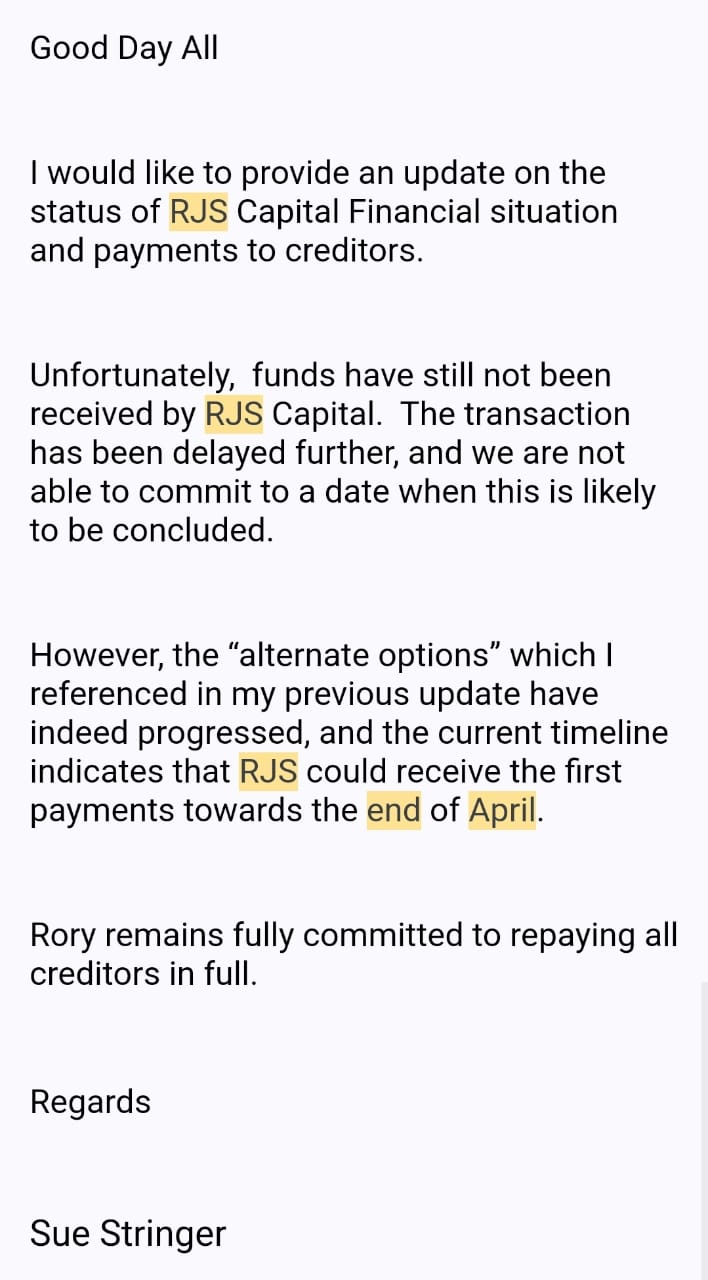 [13] In March 2023, RJS creditors received an email stating that “RJS could receive the first payments towards the end of April.” We are constantly reassured that Rory is fully committed to repaying all of us in full—we are still reassured to this day… and perhaps for all eternity?