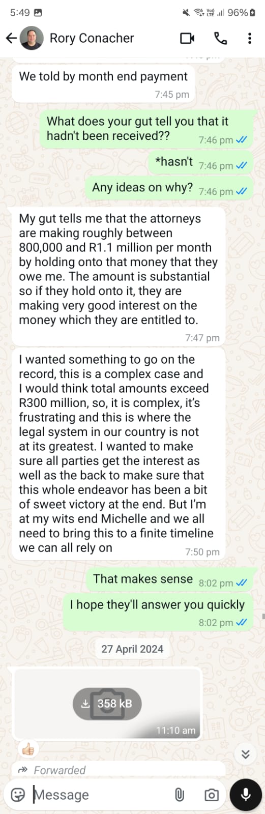 He told us that by December 2023, everything would be sorted because the ruling was clear and payments were due. The court system was supporting us, the attorneys were processing the files, but payments to SARS and other obligations needed to be cleared first. We were at the back of the queue but still in line for payments that were secured and supposedly happening.