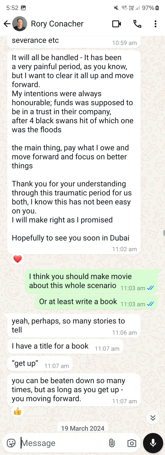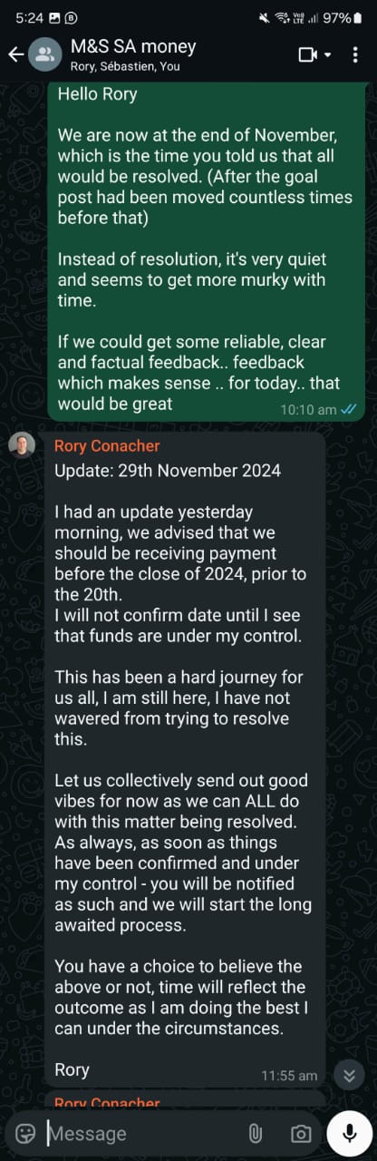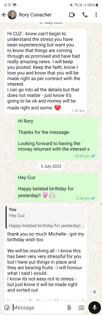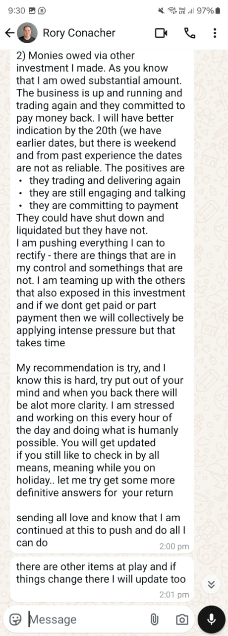Despite all the back-and-forth, the truth remains elusive. Where has the money really gone? Why does Rory keep moving the goalposts? These questions linger unanswered, adding to the frustration and uncertainty faced by his victims. What is clear is that his cycle of deception and delay tactics has continued for far too long, leaving those who trusted him in financial and emotional turmoil.