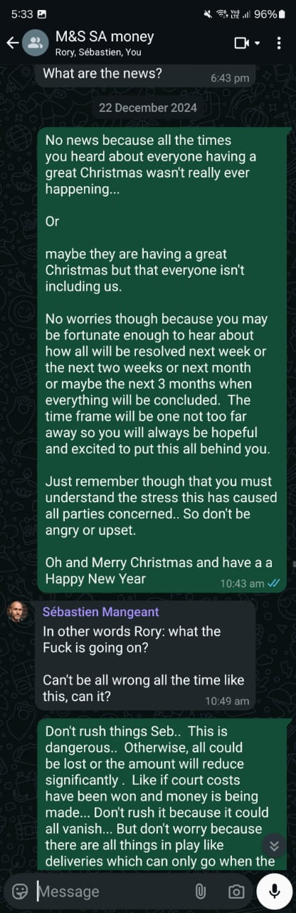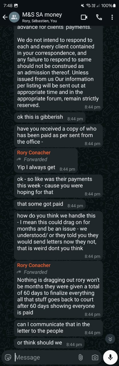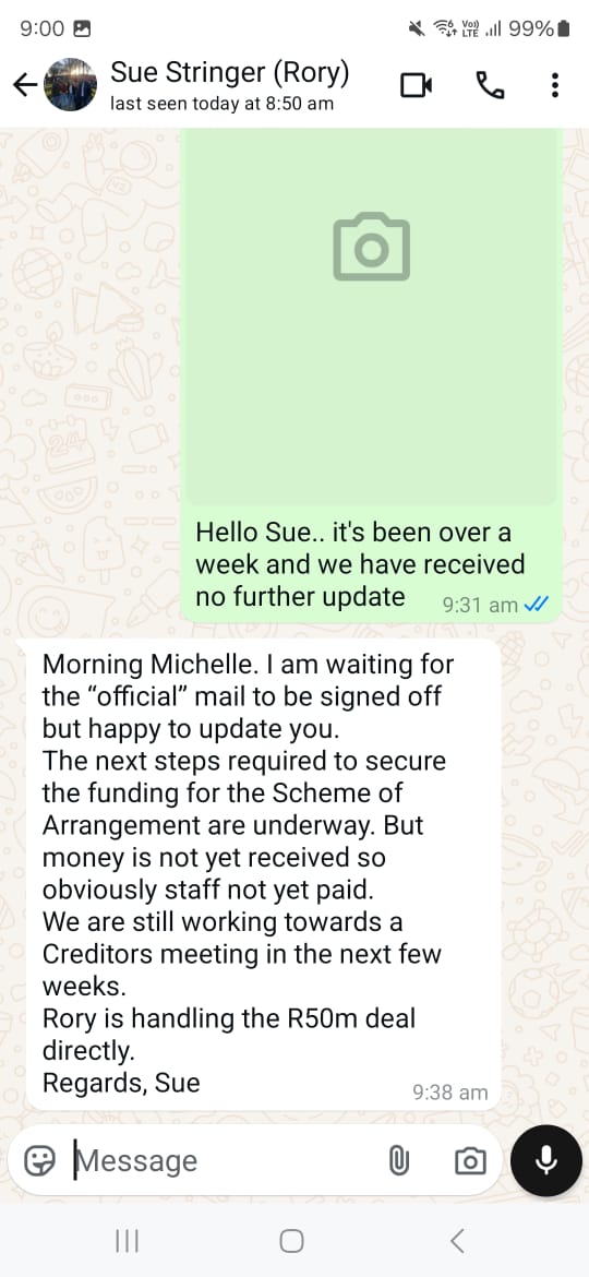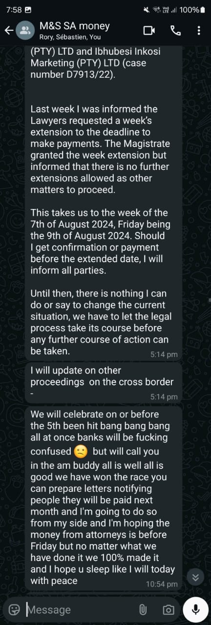 In May, creditors are told that 28 May is the final day for a deal on the case. Talk of payments coming through resurfaces, and once again, we are thanked for our patience. Still completely lost, we create a WhatsApp group between the three of us because, at this point, I have no idea what the hell is going on anymore.