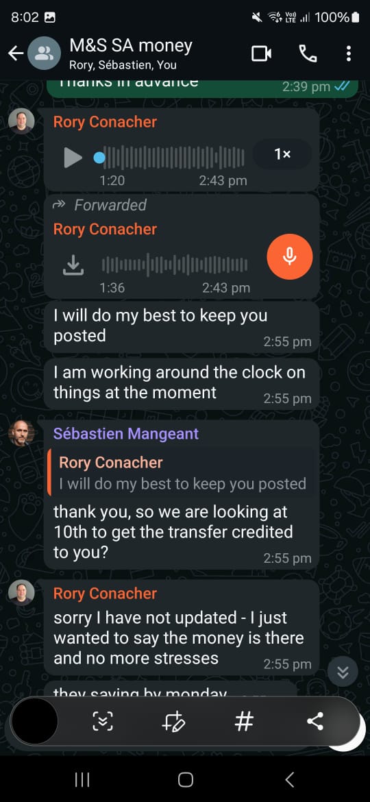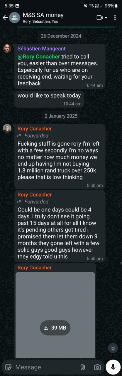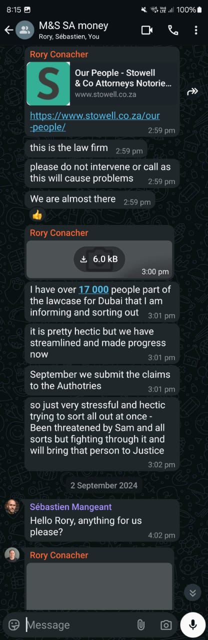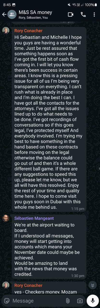 On April 12, 2022, my husband gave Rory a significant amount of money. On April 19, an equally significant amount—representing our UAE savings—was given to Rory. Back in South Africa, I had sold three properties and put all my life savings into a stock account that was performing poorly. I wanted to move the funds, and Sebastien suggested I pass them on to Rory. So on May 11, 2022, we transferred my entire life savings to Rory. At this point, I felt a little uncomfortable, but Sebastien reassured me: I was family, Rory clearly loved me, and if it was a Ponzi scheme, I’d be protected—he’d get me out. Rory was, and still is, adamant that it was never a Ponzi scheme.