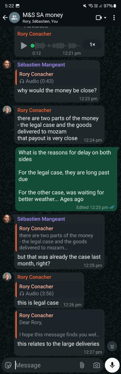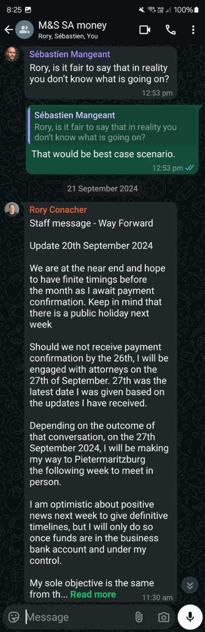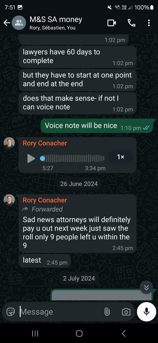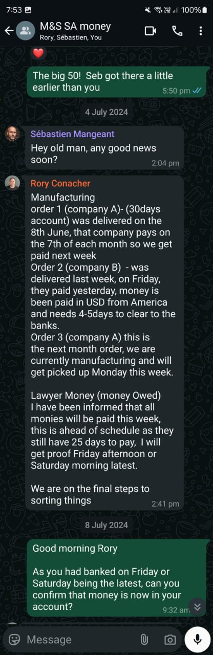 [18] In June 2024, we received a bunch of gibberish, confusing messages forwarded to us. We have no idea what’s going on, and I start giving Rory the benefit of the doubt—maybe he doesn’t either. [22] But then, there’s a forwarded message stating that payment will come next week, no later than 26 June. [19]