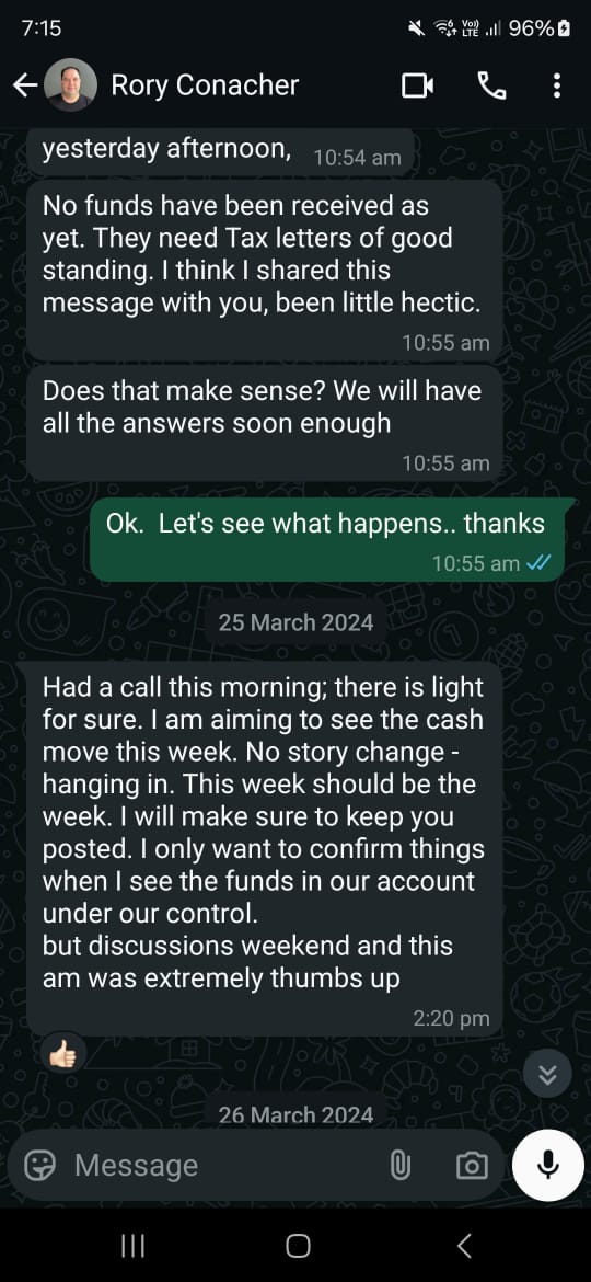 By January 2024, I was becoming more impatient, so I left my husband to handle the conversations with Rory, as it was causing me too much emotional stress. Honestly, I didn’t care how he lost the money—I just wanted it back or, at the very least, to know for certain that it was never coming back so I could have closure.