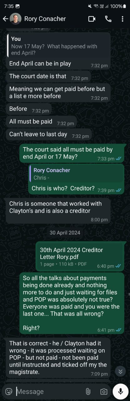 [222] On 30 April 2024, we are told that the matter is back in court, with a date set for 7 May. Once again, we are thanked for our patience. Later, Rory messages, saying, No, Clayton got it wrong—the magistrate didn’t sign off on it. [21] What? But on 7 May, Clayton sends a message saying that everything is done and paid. [EEE]