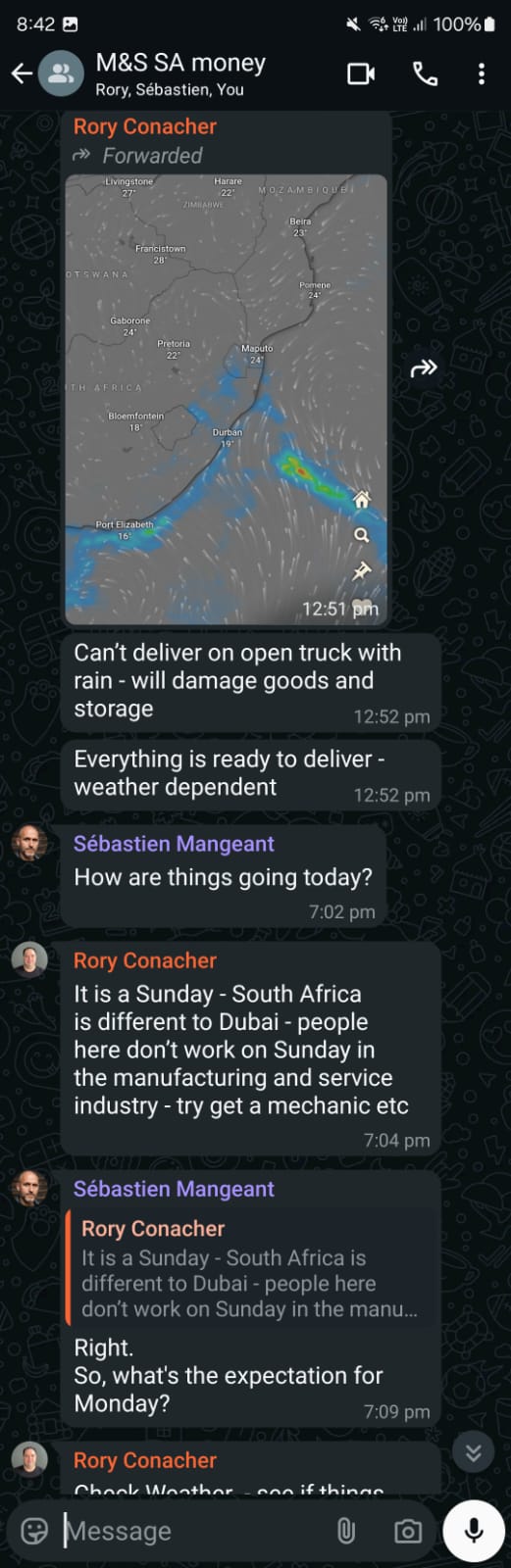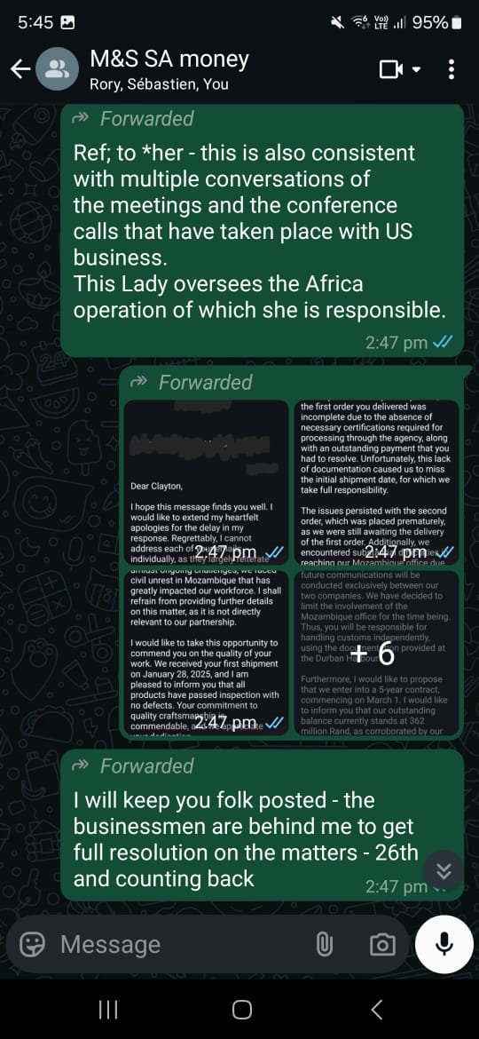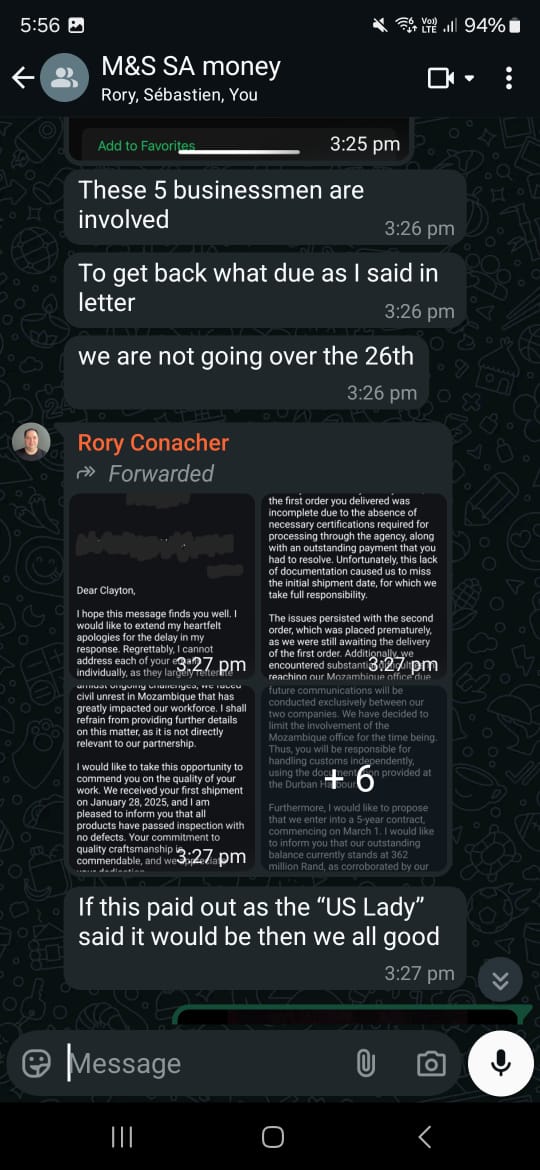 [29] On 5 February, we get another date of funds being received on 26 February following a delivery of shipment where the receiver is delighted with what’s being received. We should be happy and celebrating but we don’t do anything.. We don’t even respond. This is the first time that I hear about Businessmen working with Rory to help to get all these things resolved. [24] Together we are strong, he says. We are not going over the 26th, he adds [25]