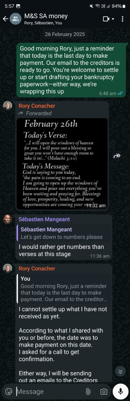 26 February arrives, and instead of sending us money, he sends us a prayer.[26] He also speaks at length about these “cooperative businessmen” who are supposedly assisting him. He even sends us their names from their WhatsApp group.