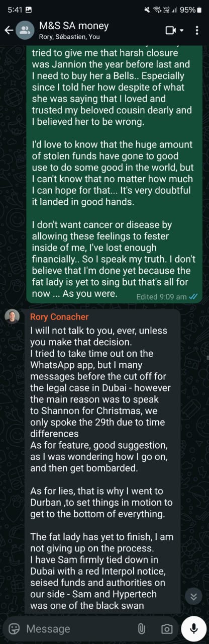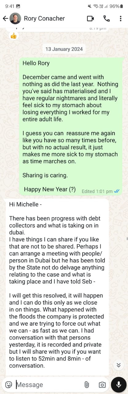 [8] On 3 January, I have another rant with Rory and go on about how he just shares lies with us over and over again.. It’s really not cool. Then I voice my inner thoughts of where the huge amount of stolen funds actually landed up and I’m genuinely hoping it landed in some good hands??? [28] Rory answers me with blah blah blah.. Hope for a Dubai case, we hear how he hasn’t given up.