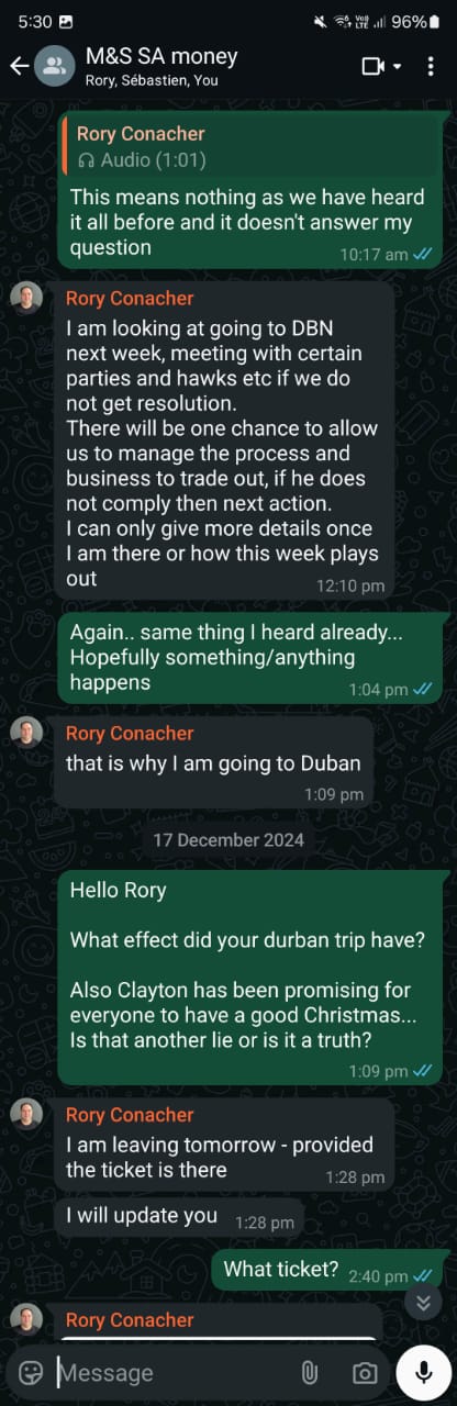[31] Then, on 10 December, Rory declares that he would fly to Durban and sort things out. [GGG] More voice notes from Clayton followed [HHH] … but by now, we all knew that there was no substance behind any of it. Nothing ever came of anything.