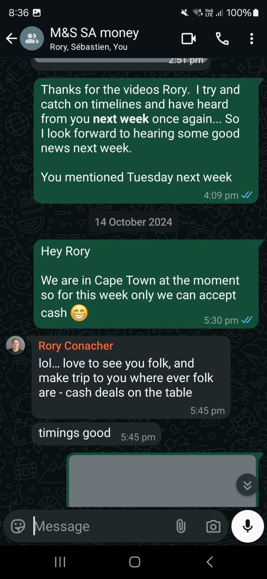 On 14 October 2024, while in South Africa, we jokingly tell Rory that we’re in Cape Town and that he can bring us a suitcase of cash. He responds, “Cash deals are on the table, timing’s