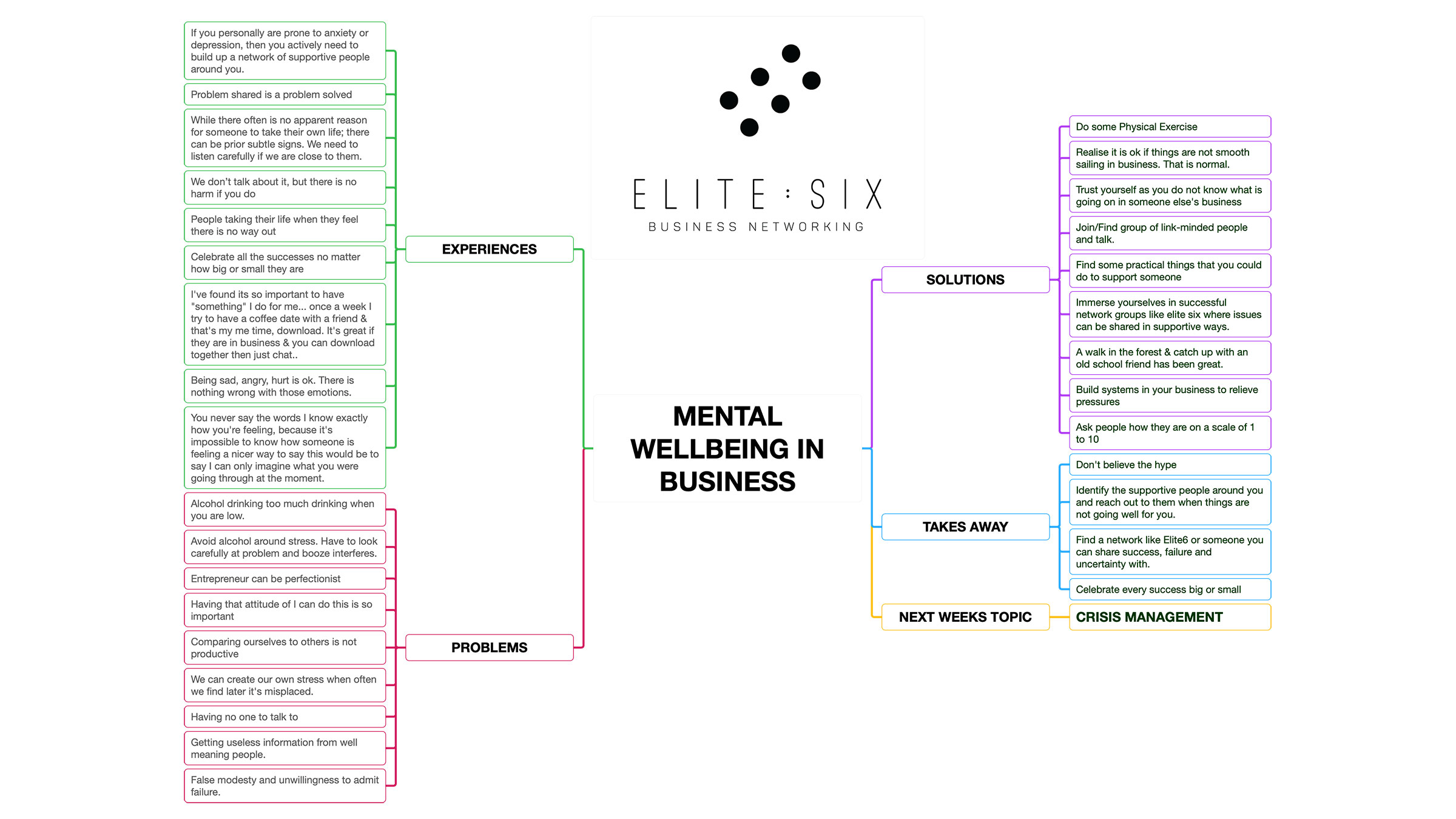 ELITE : SIX meetings are discussed over ZOOM with our members every Friday at 9:30am. Think Tank Topic: Mental Wellbeing In Business.