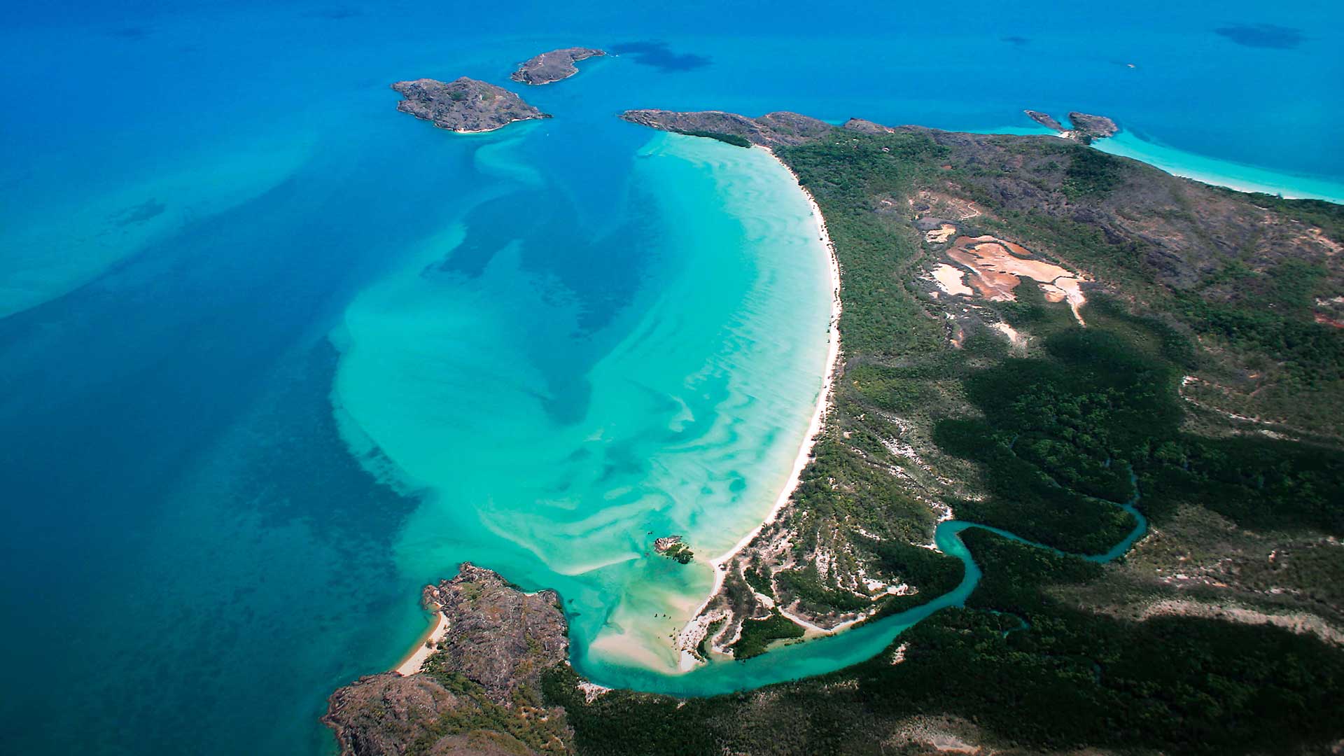 The great tapering Cape York Peninsula thrusts into Torres Strait, enclosing the vast brown mudflats of the Gulf of Carpentaria.